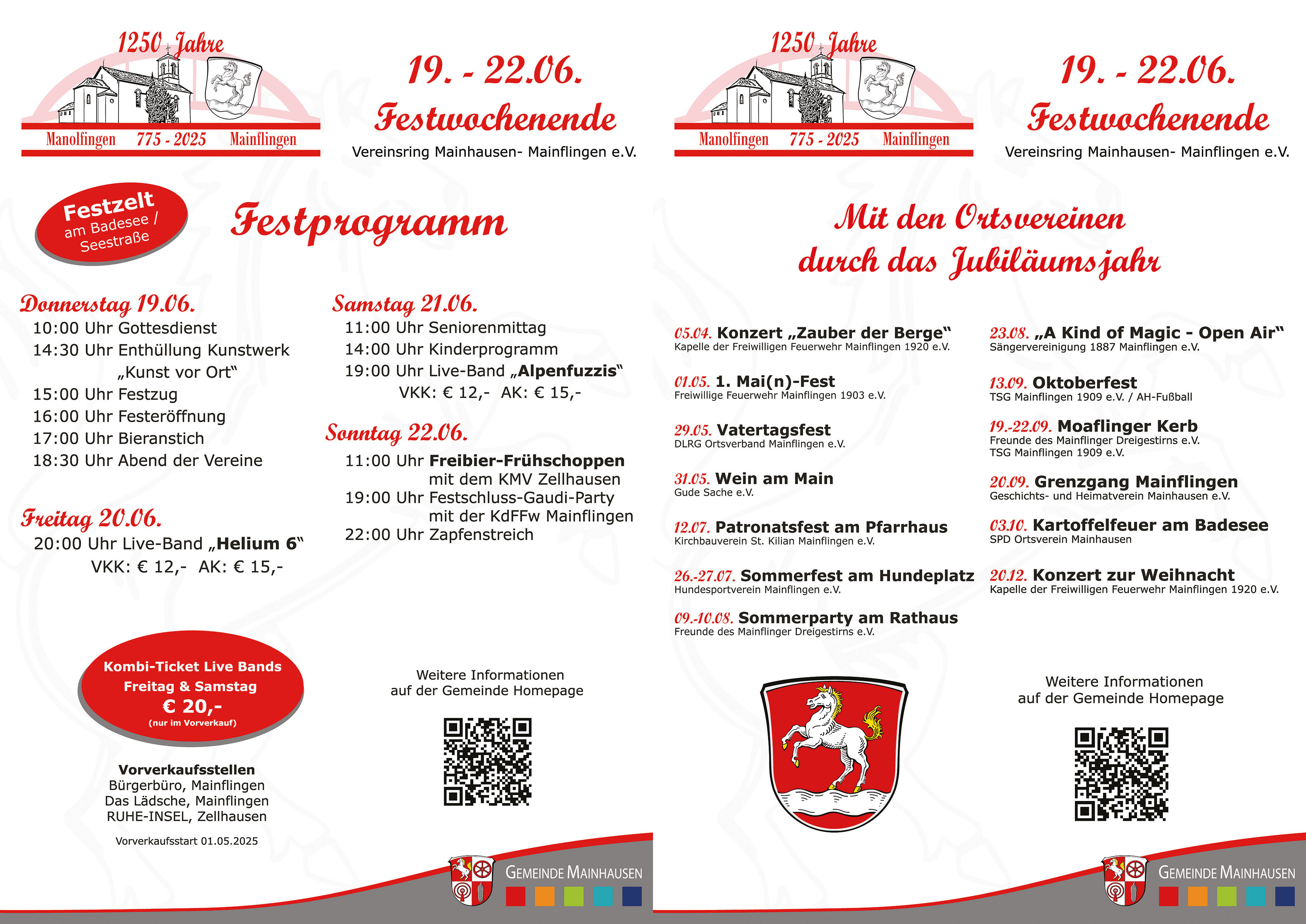 Willkommen zu einem ganz besonderen Jahr für Mainflingen! 2025 feiern wir 1250 Jahre Mainflingen – und das nicht nur am Festwochenende, sondern das ganze Jahr über mit zahlreichen Aktionen und Veranstaltungen unserer ortsansässigen Vereine.